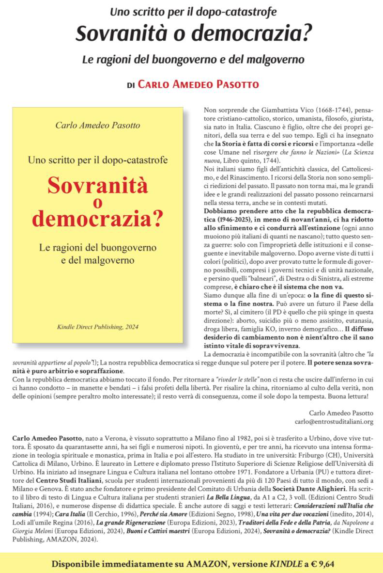Quando, nel cammino della nostra ricerca, scopriamo una verità più grande e più vera, dobbiamo lasciare, senza indugi e rimpianti, quella che ormai ci appare come una pseudo verità, e abbracciare con ardore la verità vera, la Verità. Questo è avvenuto più volte nel mio passato. Quando scrissi “Cara Italia” (1995-’96) ero convinto di aver fatto un grande servizio alla verità. Eppure, che salto di qualità nei miei lavori più recenti: “La grande Rigenerazione” (2023), “Traditori della Fede e della Patria, da Napoleone a Giorgia Meloni” (20024) e “Sovranità o Democrazia? Le ragioni del buongoverno e del malgoverno” (2025).