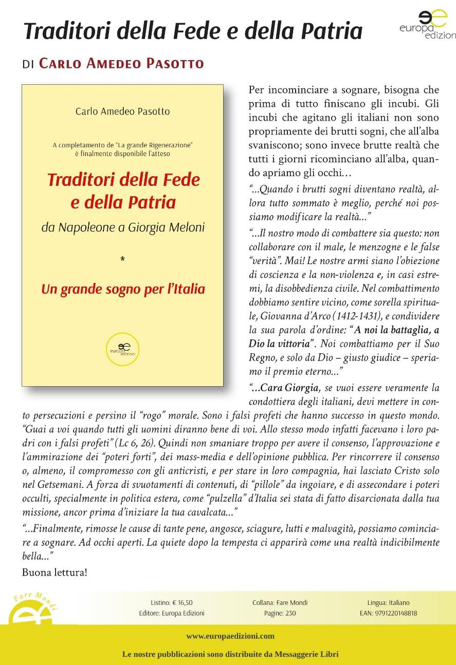 6. Traditori della Fede e della Patria, da Napoleone a Giorgia Meloni, Europa Edizioni, 2024 (€ 15). Da prenotare in libreria o reperibile in internet;